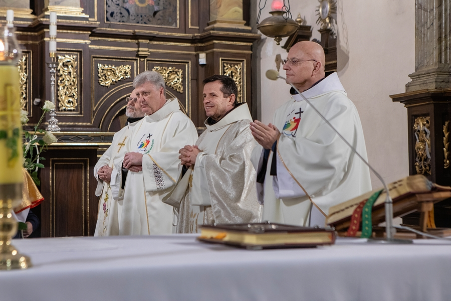 Mszę koncelebrowali wszyscy ojcowie franciszkanie OFM z Pińczowskiej wspólnoty: o. Remigiusz – gwardian, proboszcz Parafii i kustosz Sanktuarium, o. Józef – wikariusz i ekonom Domu, dyrektor i ekonom Culmen et Fons, o. Manswet – wikariusz Parafii i kapelan szpitalny, który przygotował młodzież i dzieci, o. Korneliusz i ojcowie z Culmen et Fons – o. Józef, o. Pacyfik, i o. Jakub.